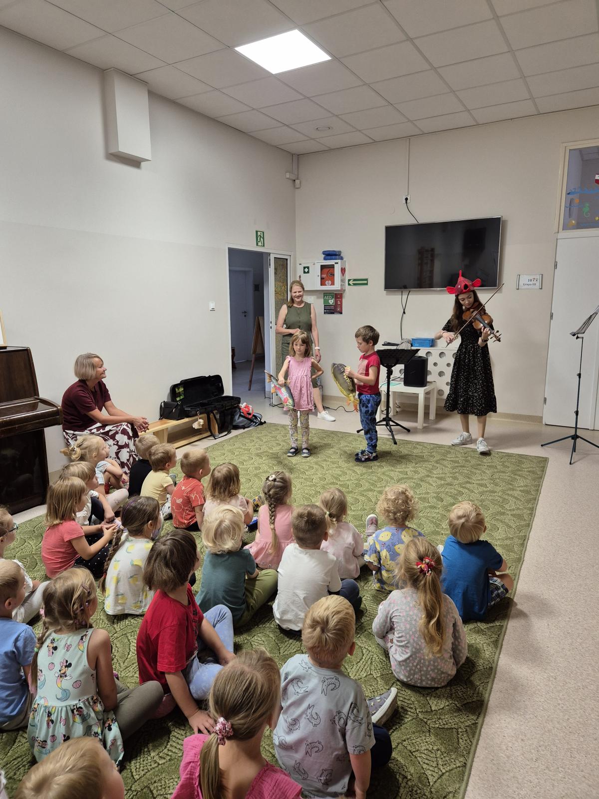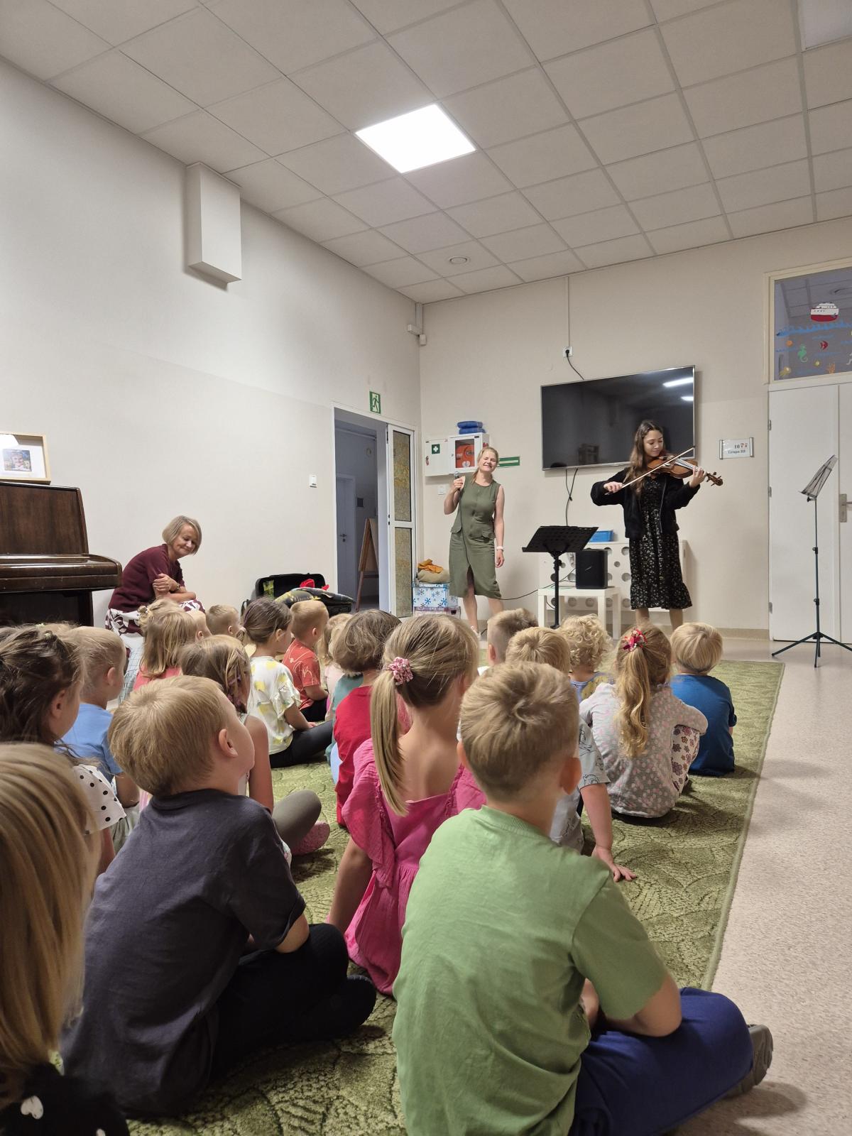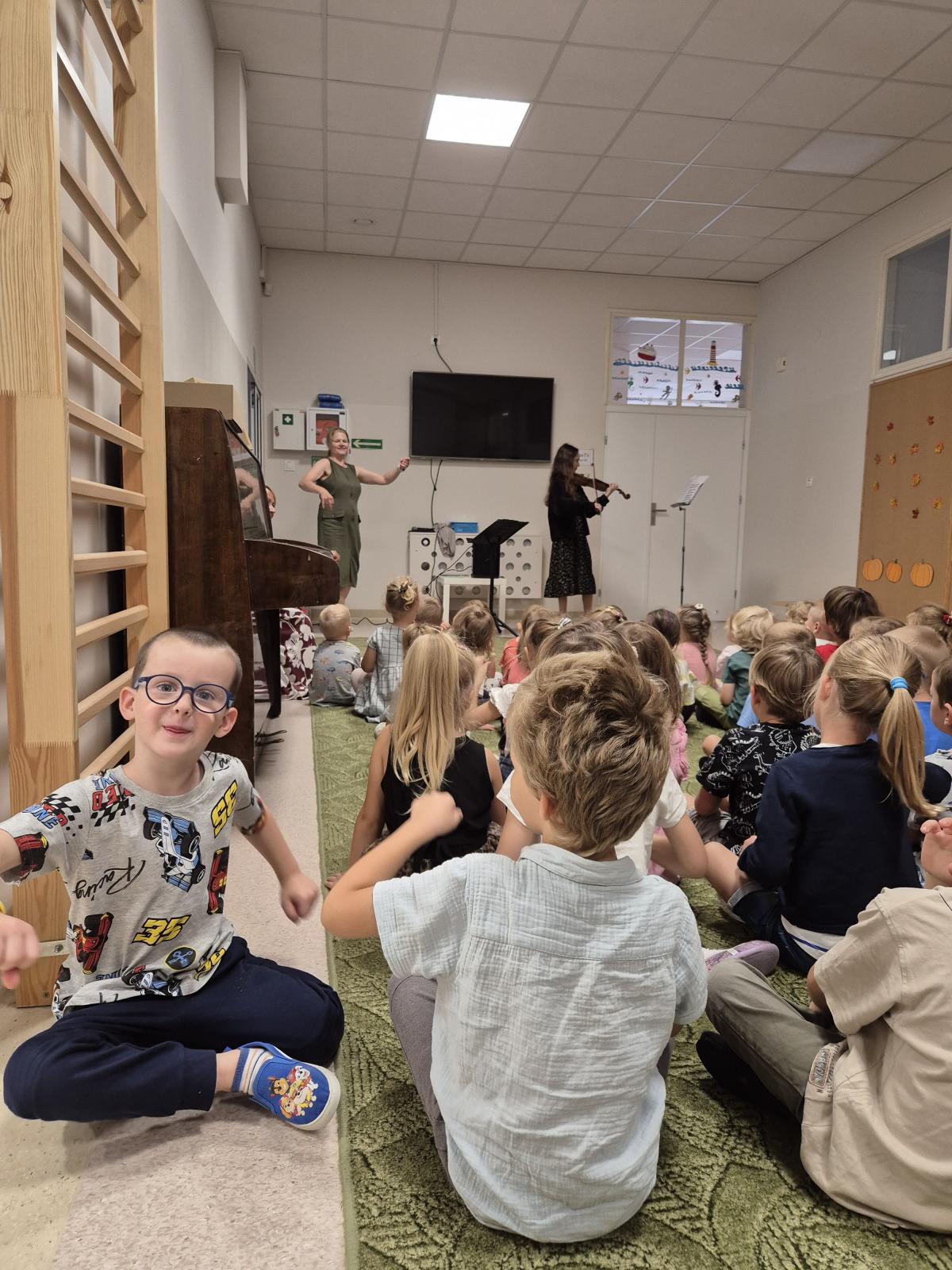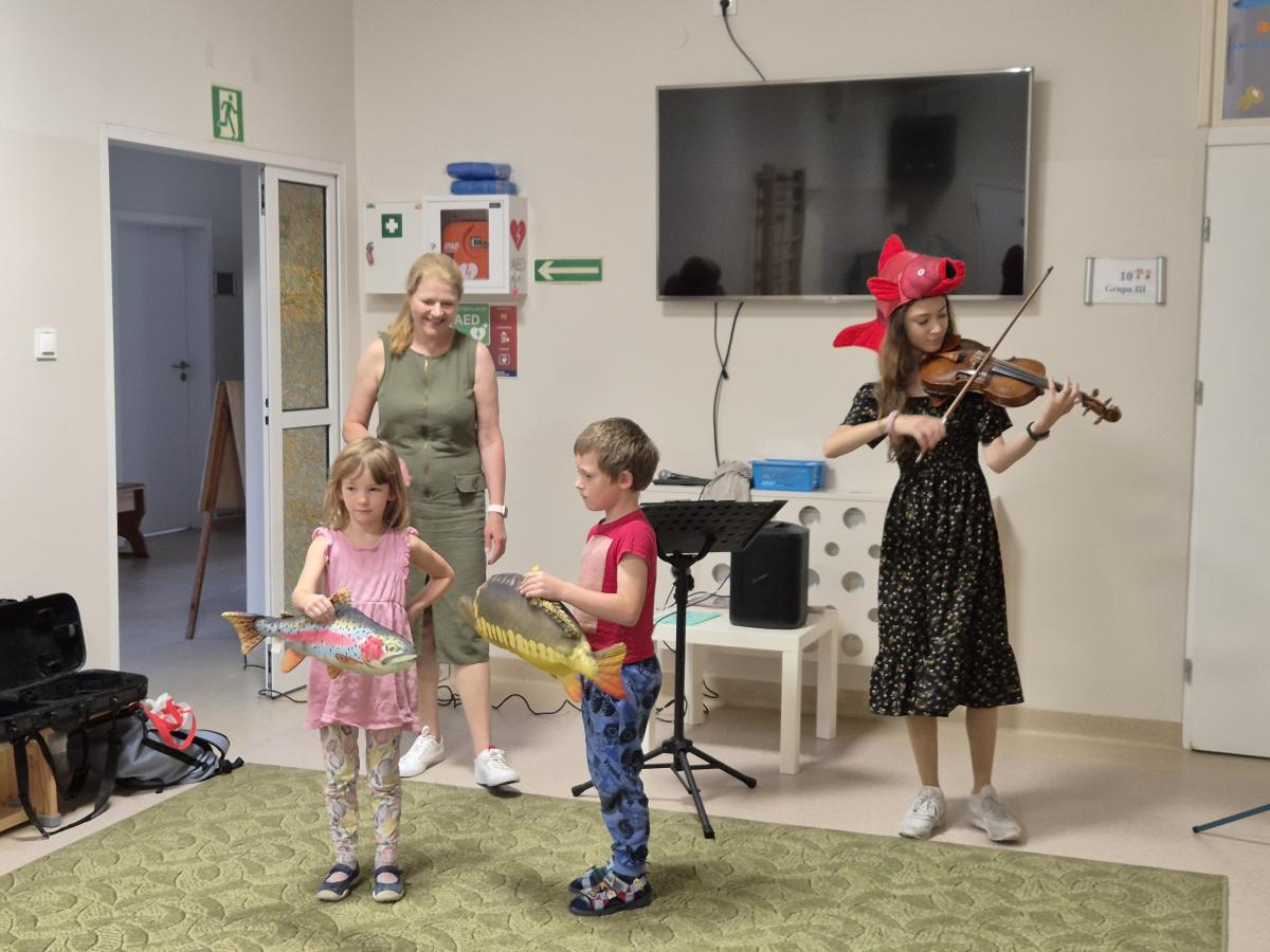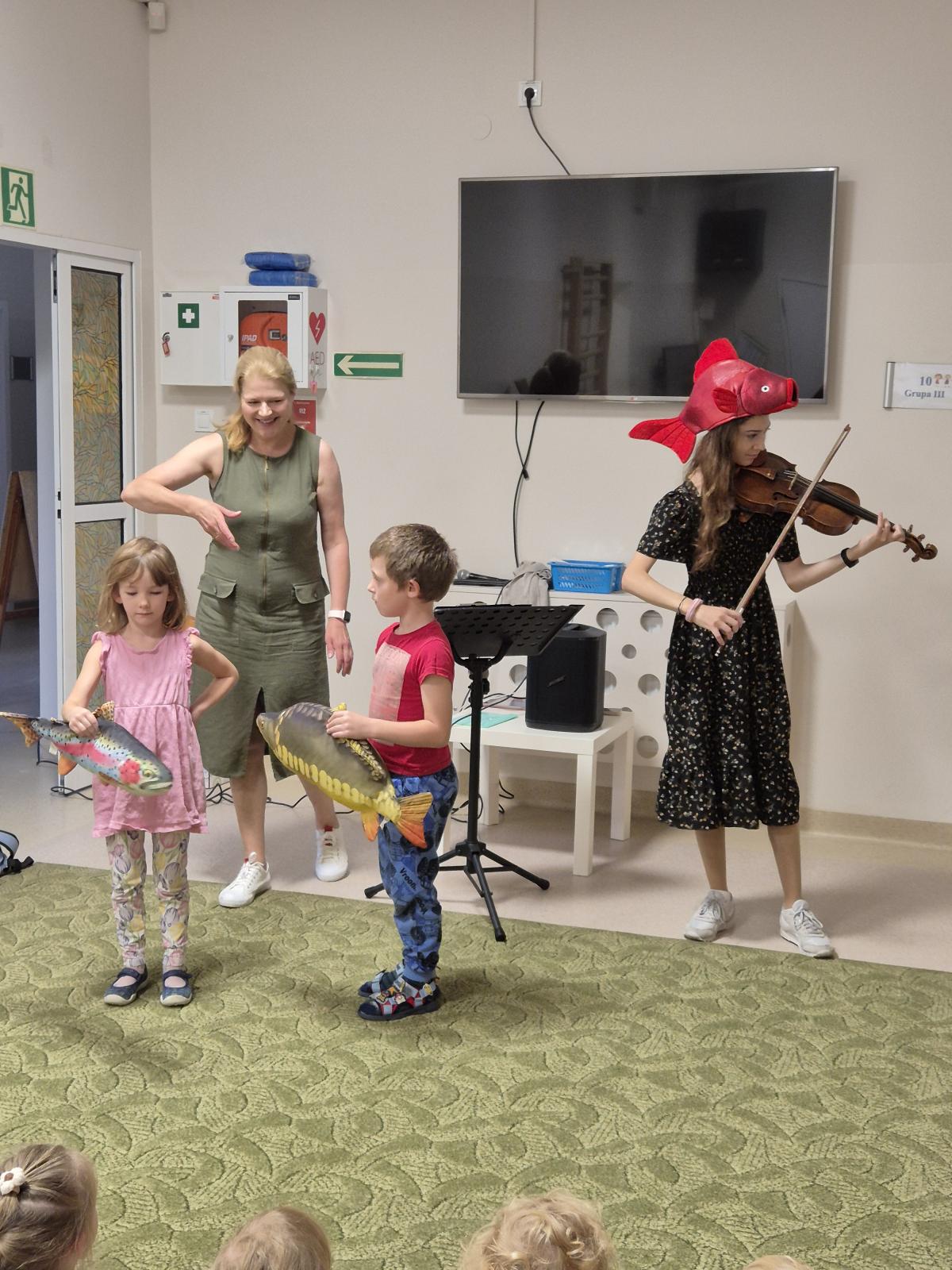 W tym roku szkolnym nasze comiesięczne spotkania z muzyką rozpoczęliśmy od zapoznania się ze skrzypcami. Poznaliśmy także nowe piosenki, a niektórzy szczęśliwcy mieli szansę "popływać" z rybkami;-)