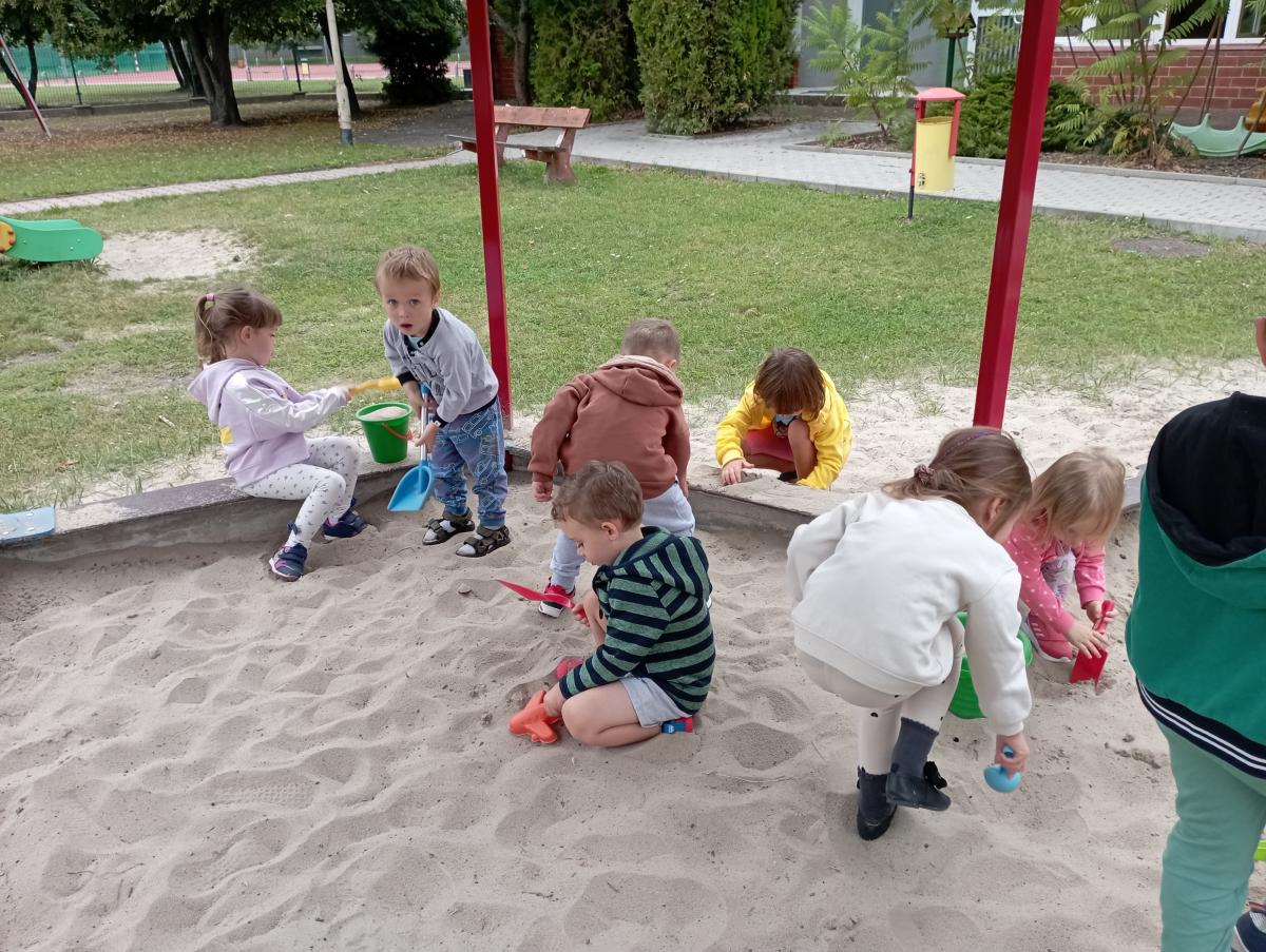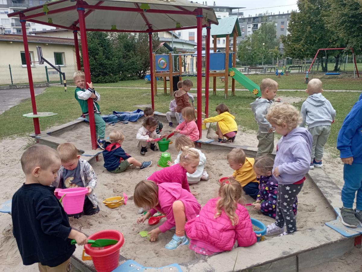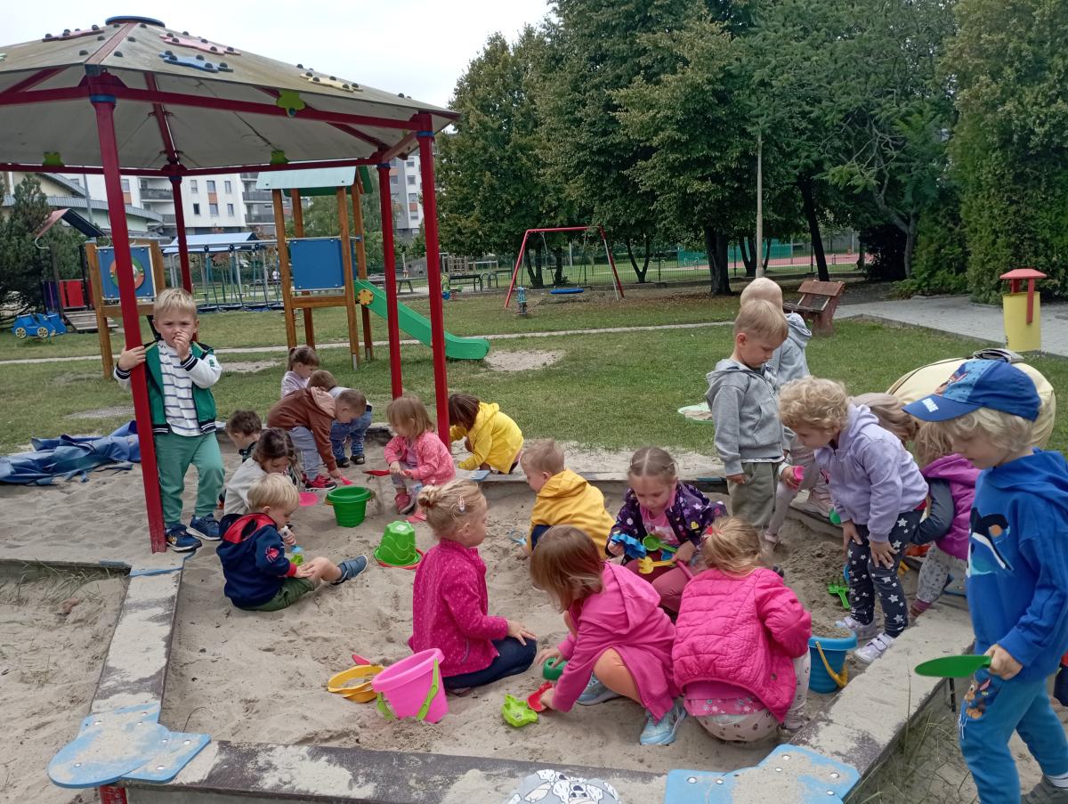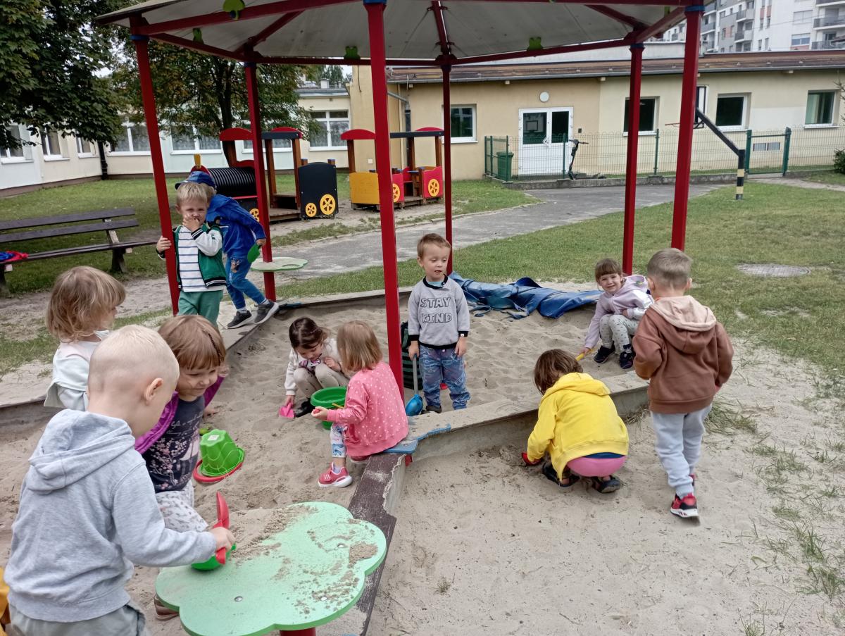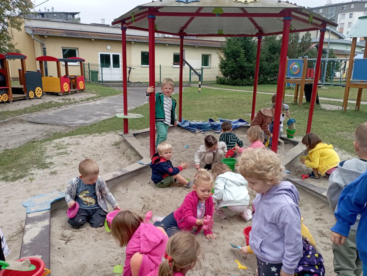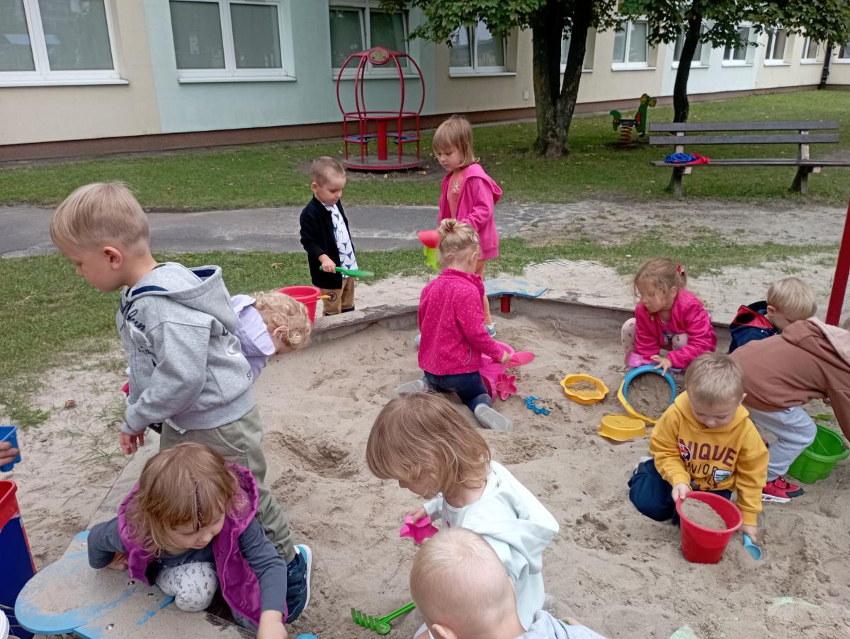 Biedronki podczas pierwszego wyjścia na plac zabaw zostały zapoznane ze sprzętem terenowym, który się na nim znajduje. Przed rozpoczęciem zabawy w piaskownicy zapoznały się z zasadami odpowiedniego korzystania z niej oraz bezpiecznej, wspólnej zabawy. W trakcie lepienia babek z piasku czas maluszkom upłynął miło i przyjemnie.
