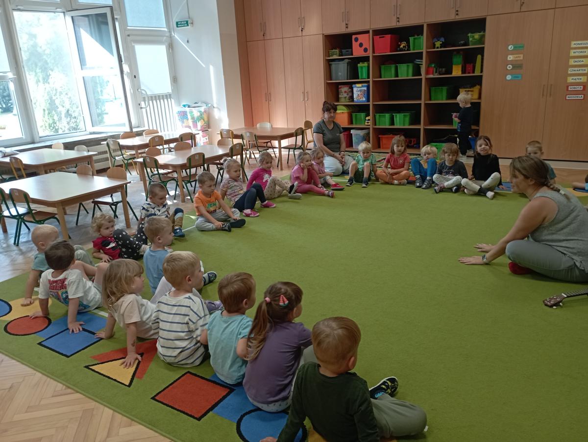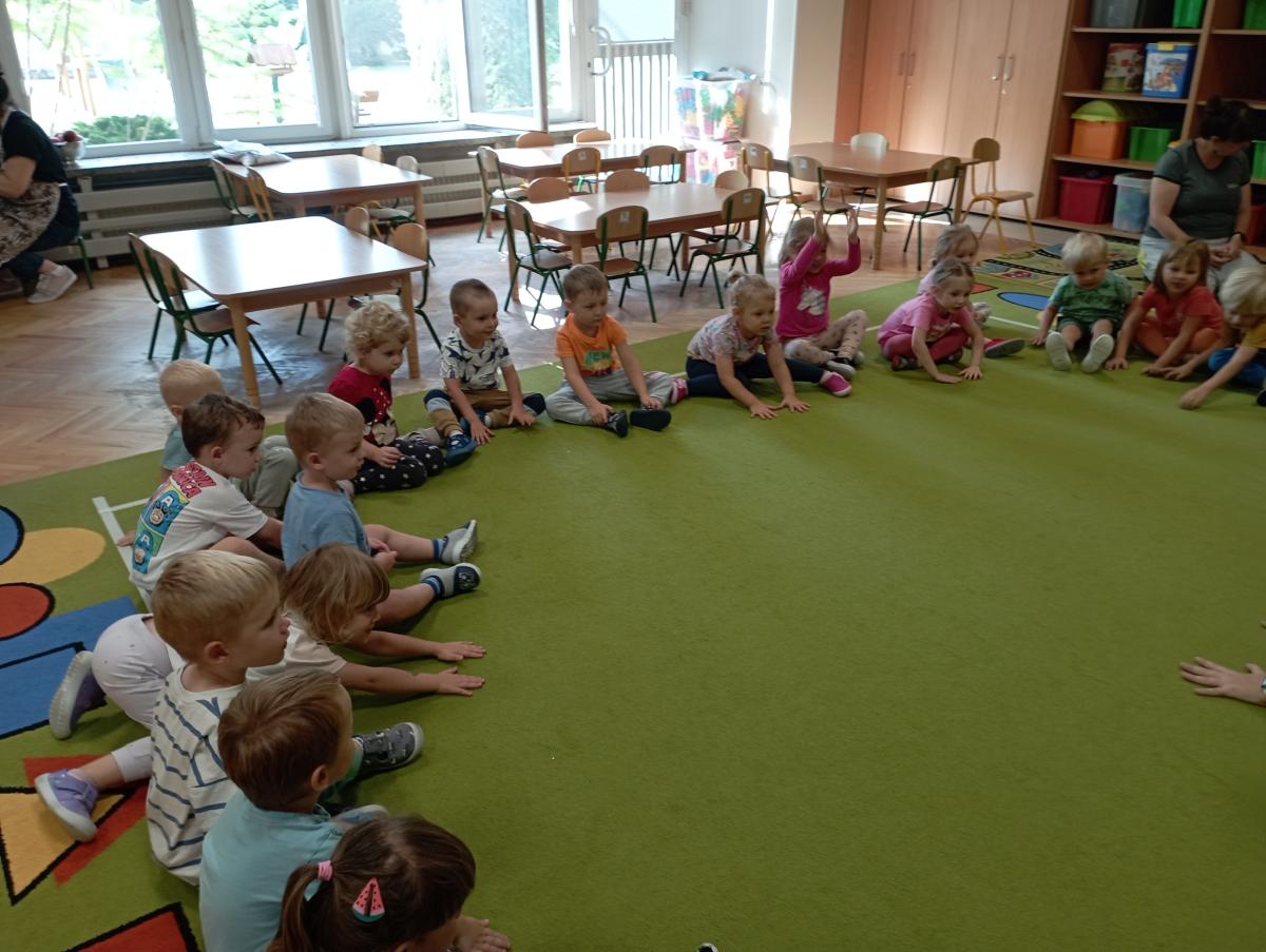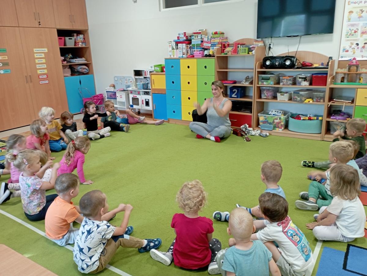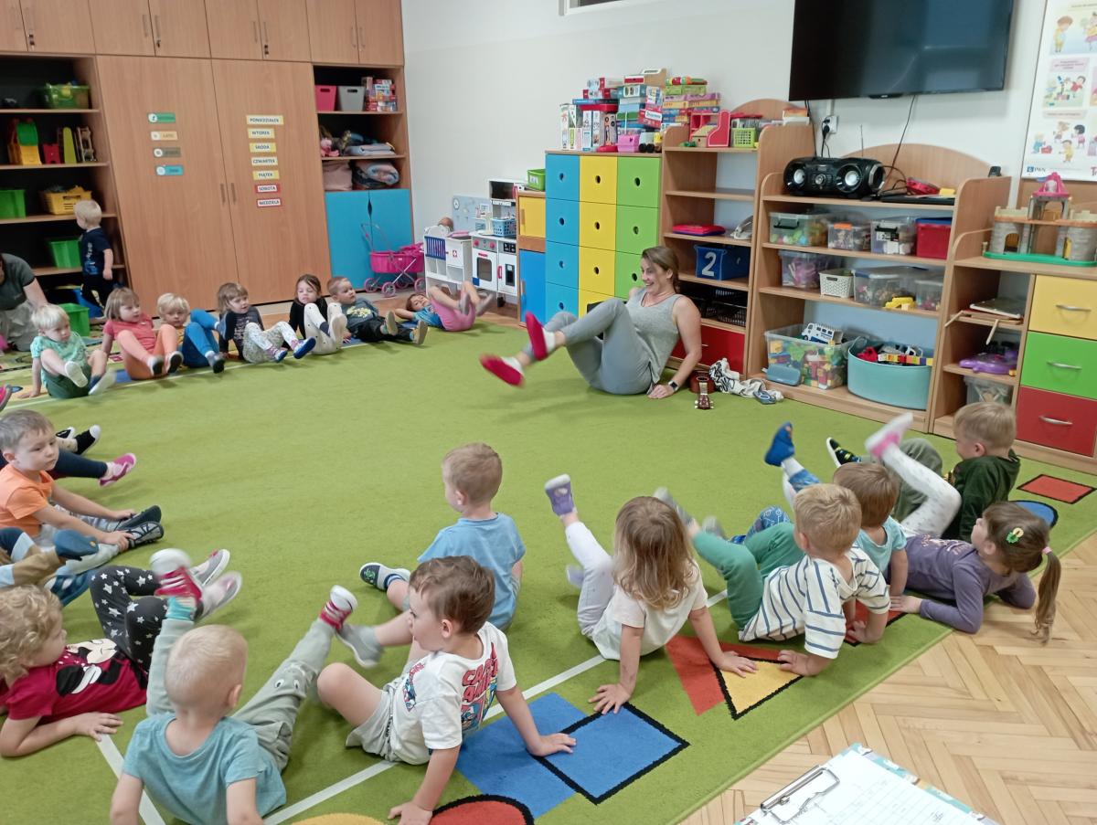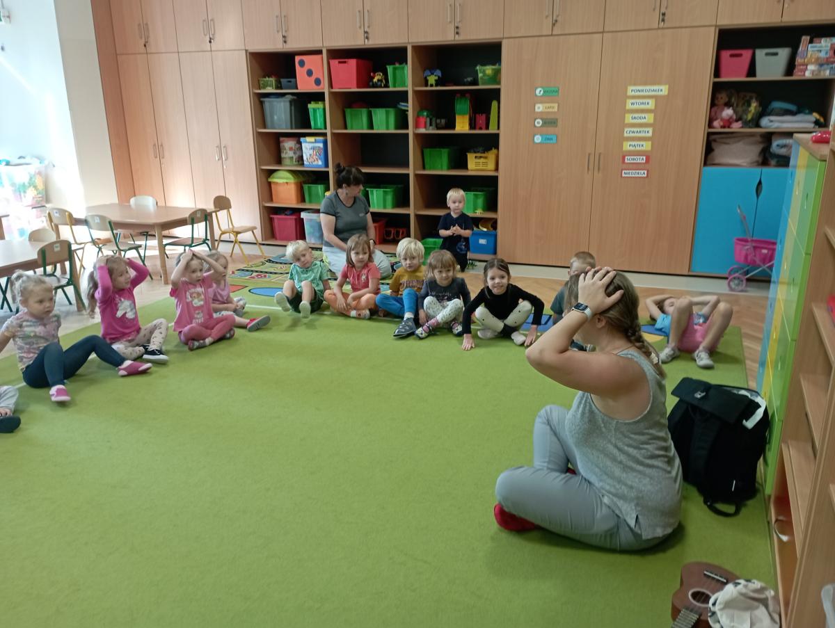 Grupa Biedronek miała swoje pierwsze zajęcia z rytmiką. Poznały nową Panią, uczyły się piosenek, a także wykonywały różne ćwiczenia w rytm muzyki świetnie się przy tym bawiąc.