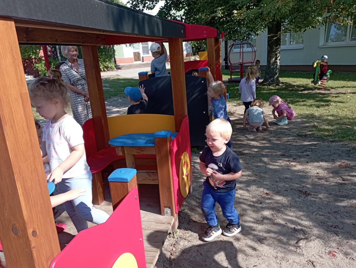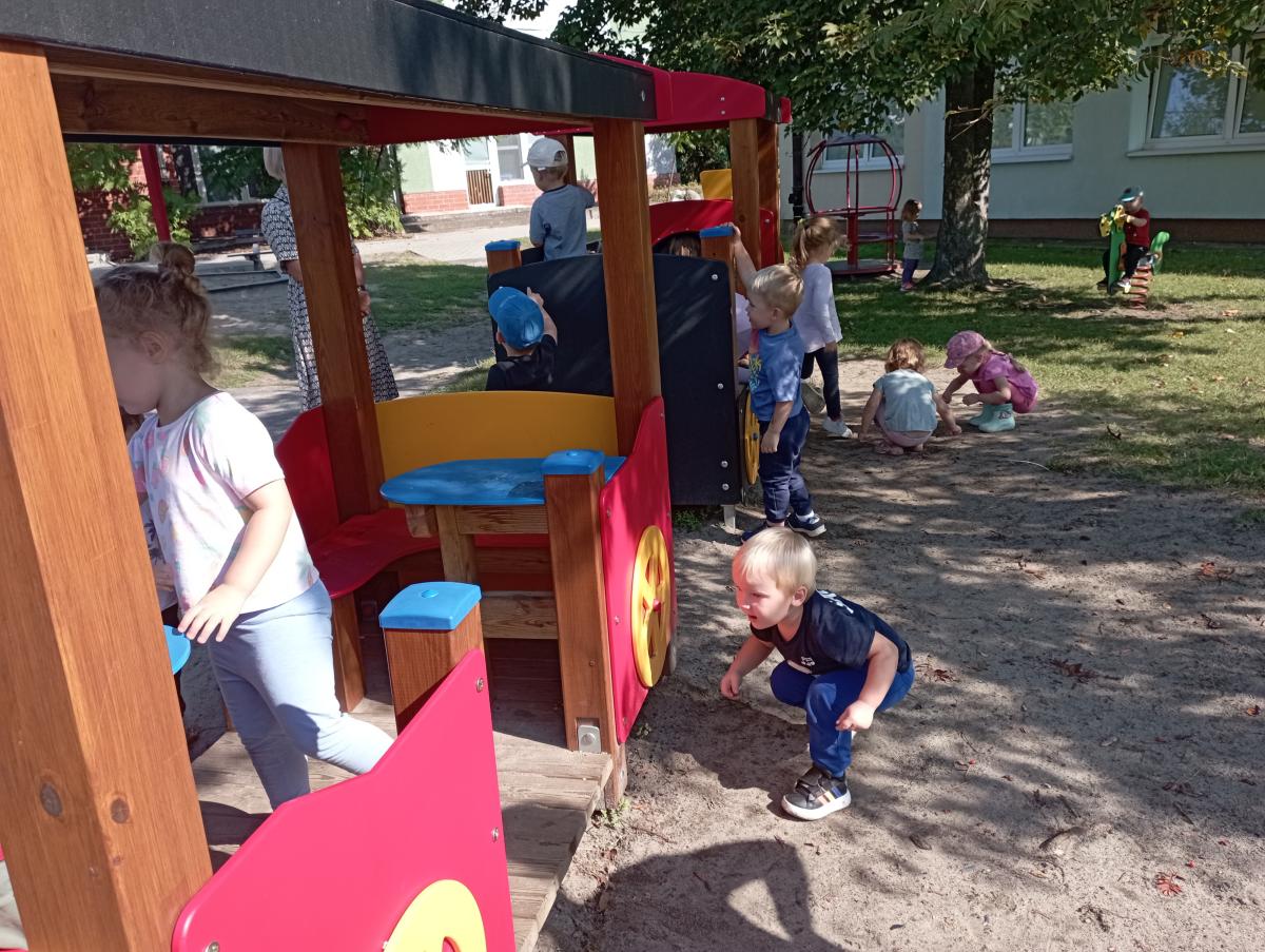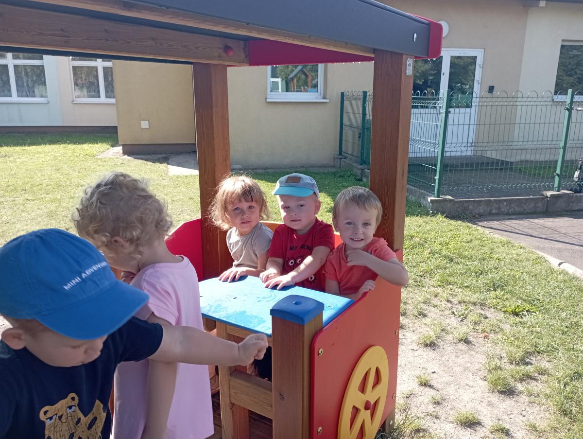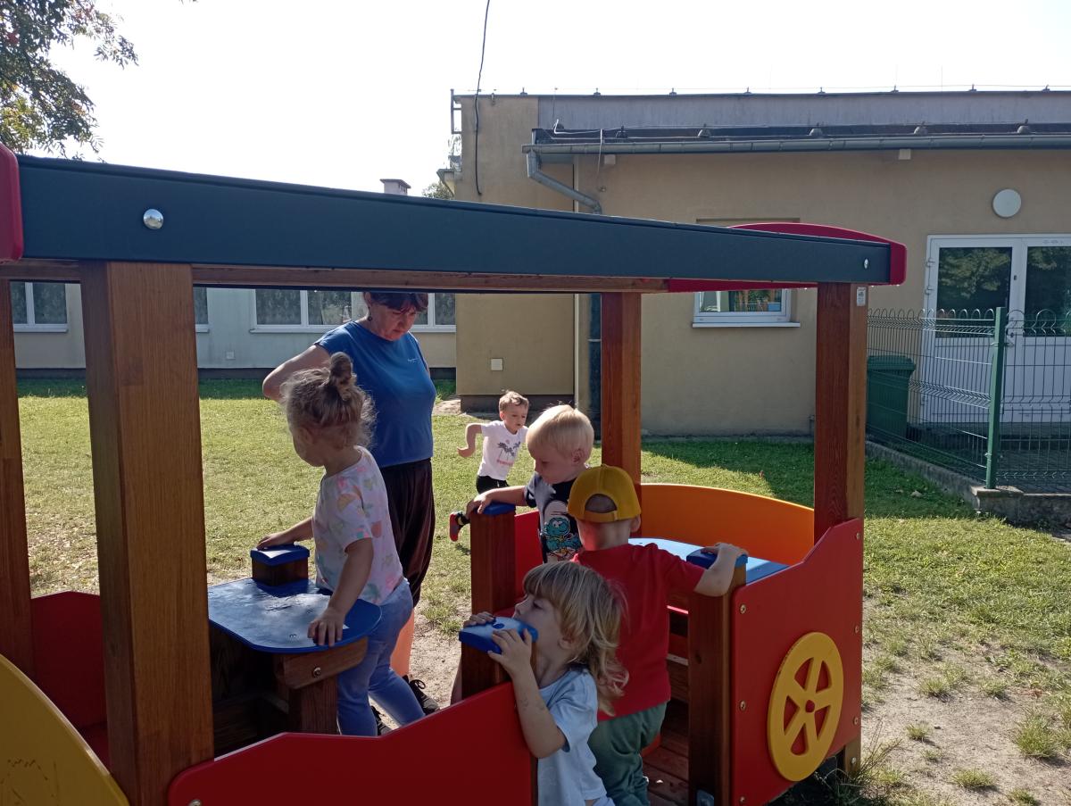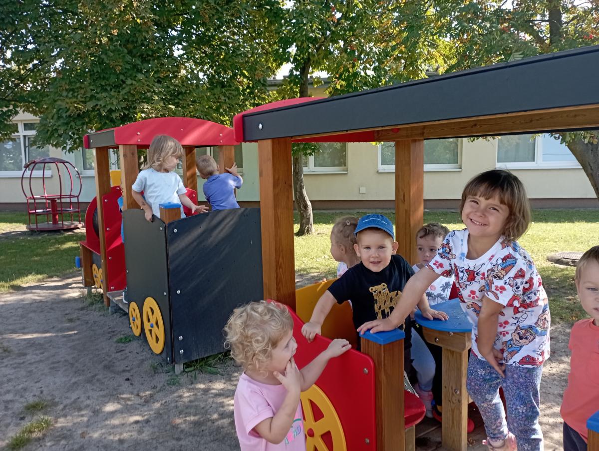 Ciuchcia znajdująca się na placu zabaw zawsze cieszy się ogromną popularnością nawet wśród naszych Biedronek. Dzieci chętnie skorzystały z tej atrakcji wymyślając rozmaite podróże w które mogłyby się dzięki niej udać.