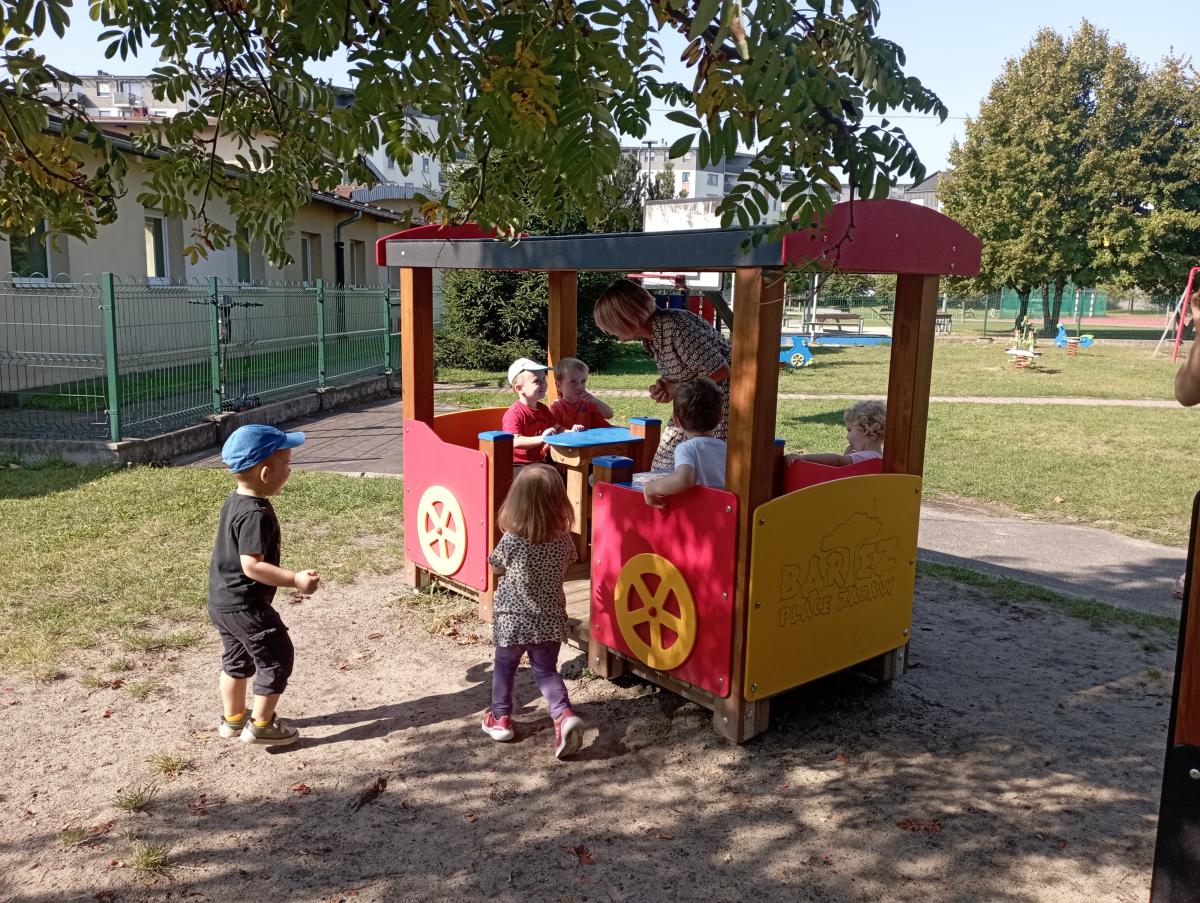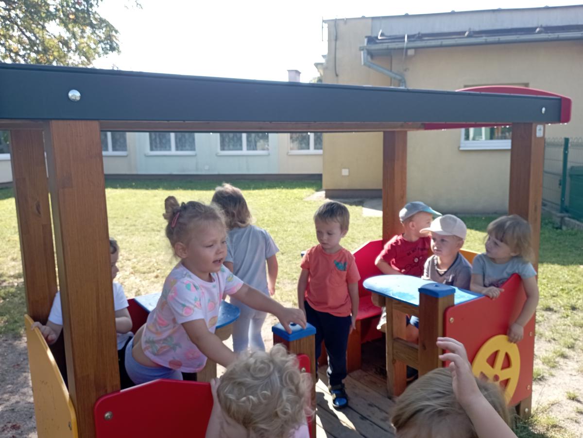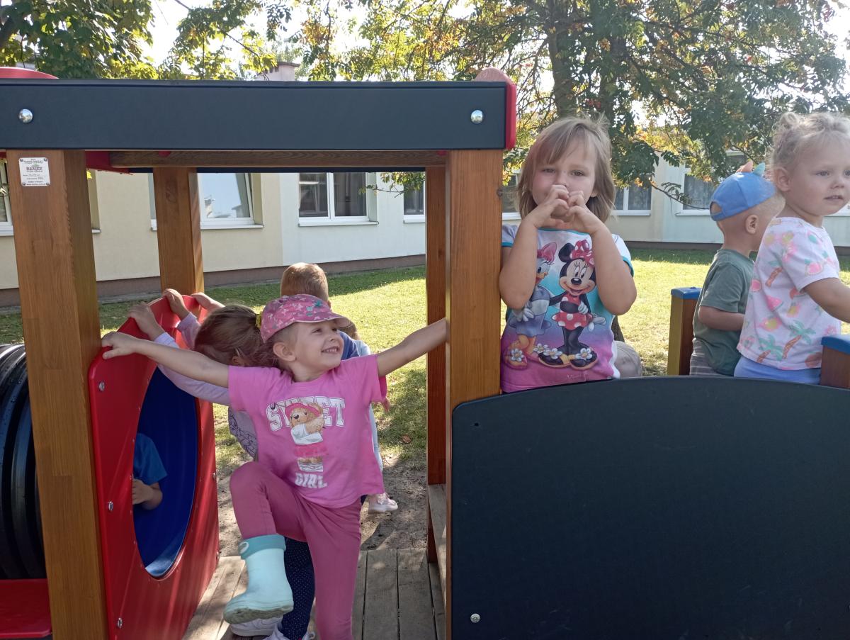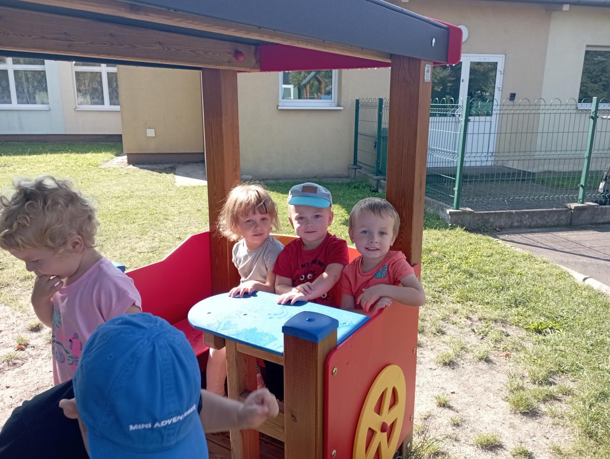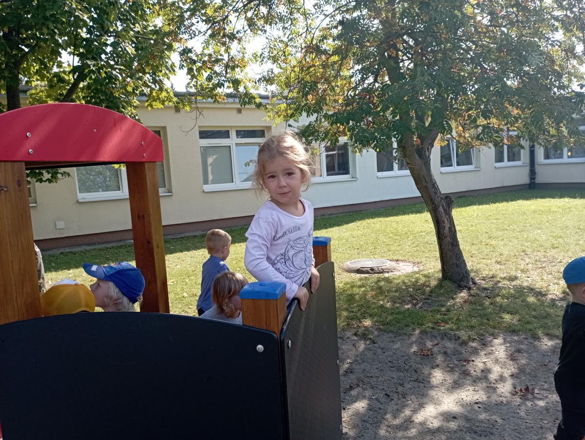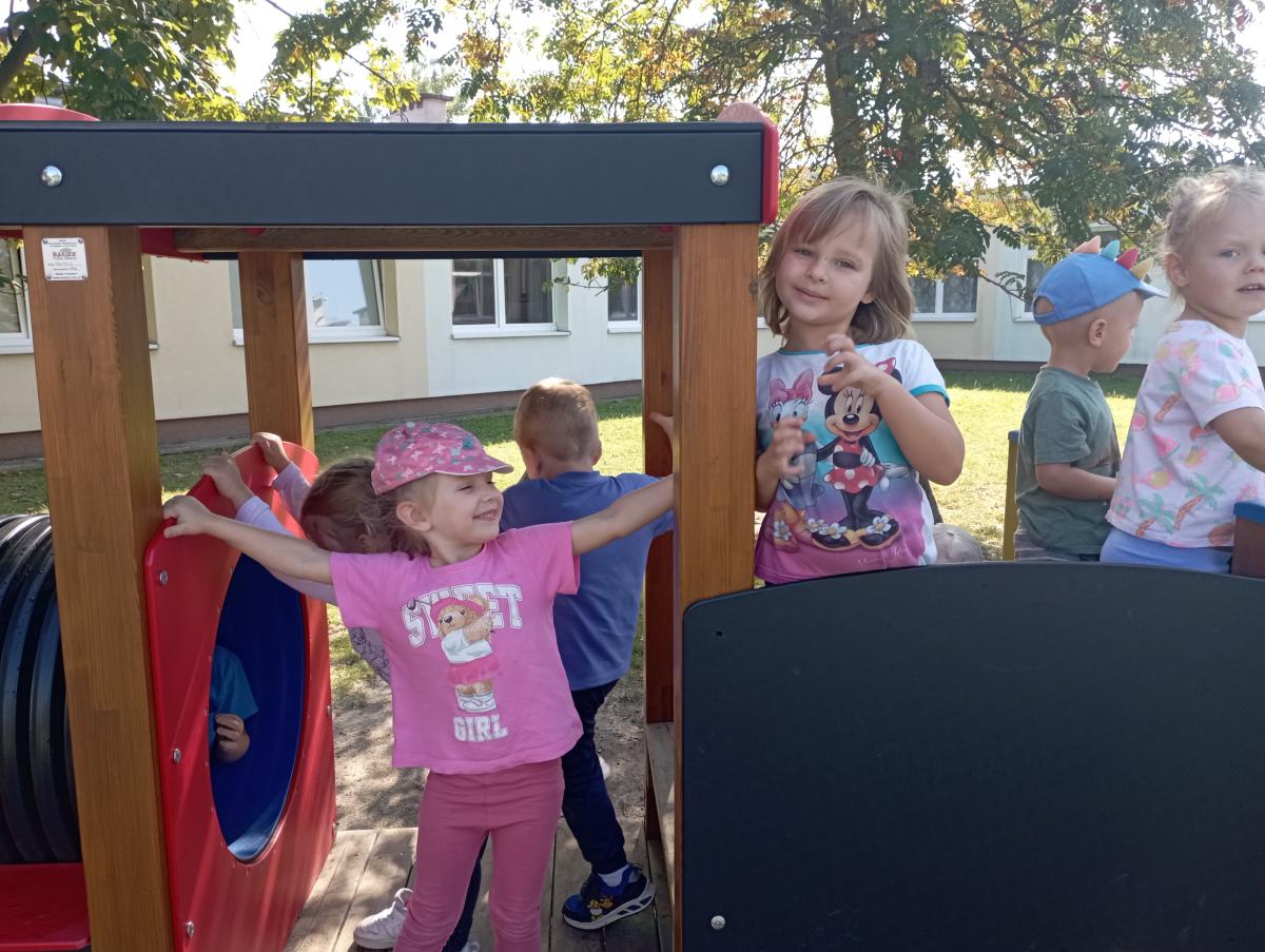 Ciuchcia znajdująca się na placu zabaw zawsze cieszy się ogromną popularnością nawet wśród naszych Biedronek. Dzieci chętnie skorzystały z tej atrakcji wymyślając rozmaite podróże w które mogłyby się dzięki niej udać.