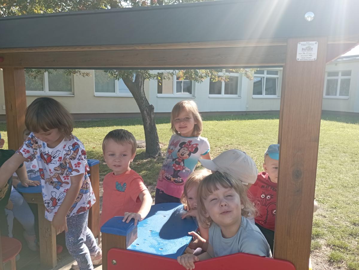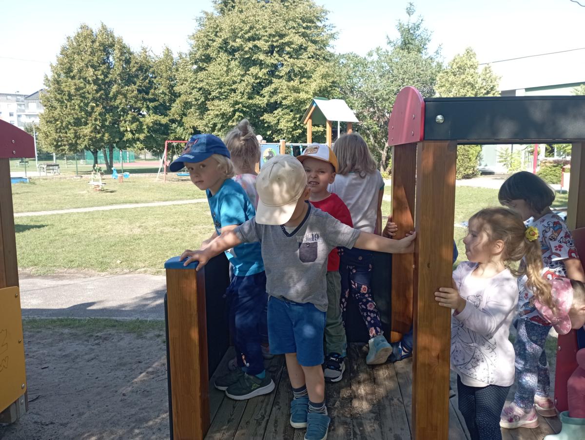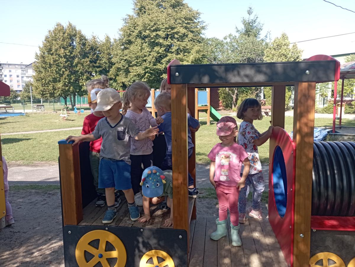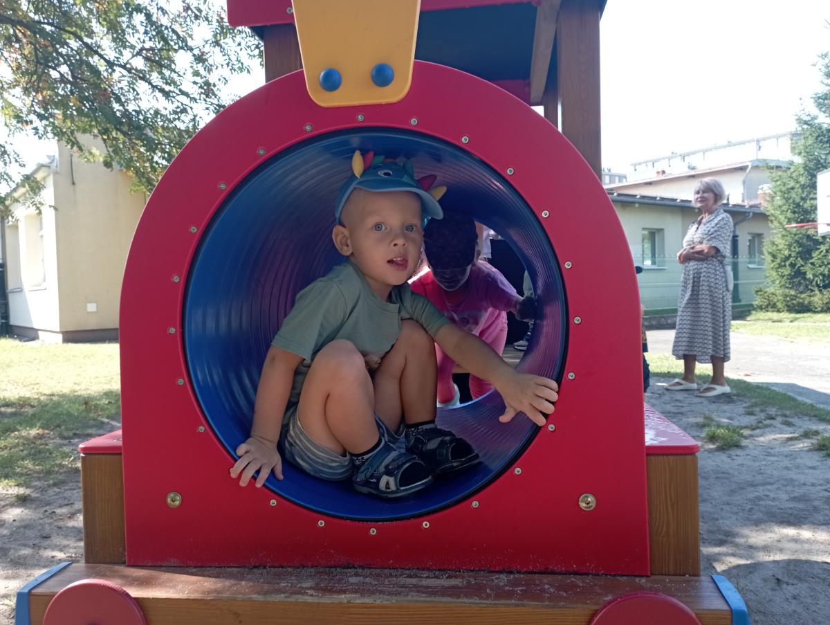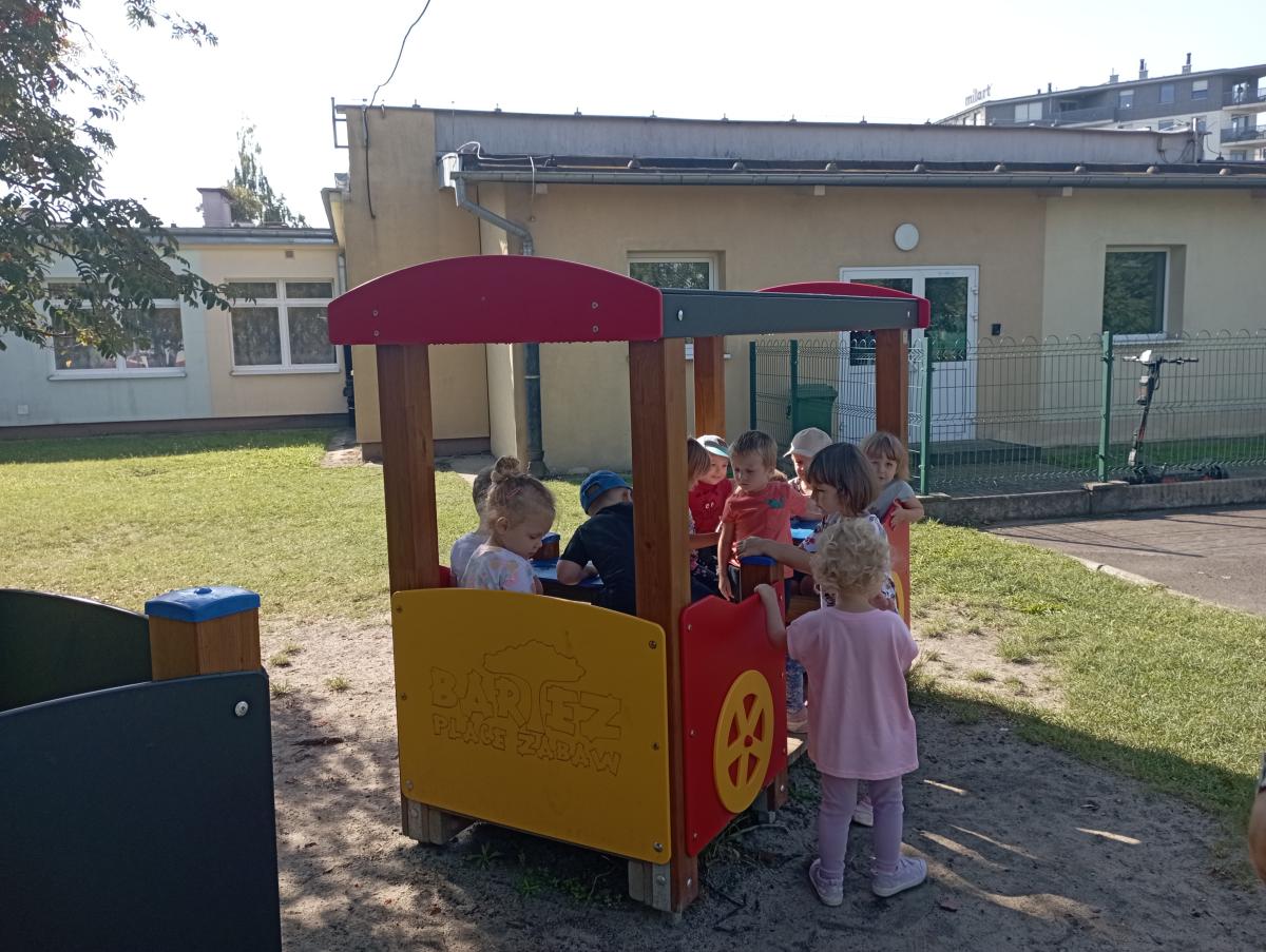 Ciuchcia znajdująca się na placu zabaw zawsze cieszy się ogromną popularnością nawet wśród naszych Biedronek. Dzieci chętnie skorzystały z tej atrakcji wymyślając rozmaite podróże w które mogłyby się dzięki niej udać.