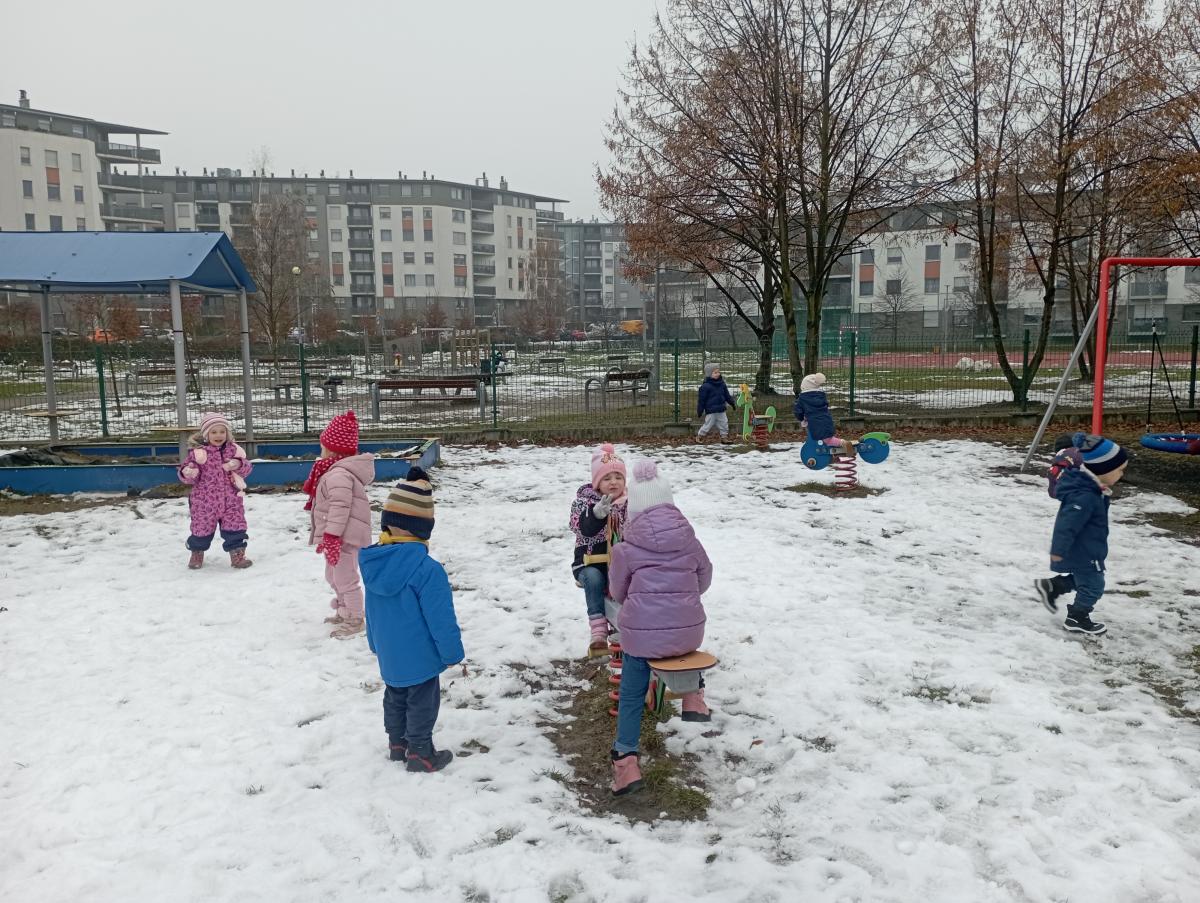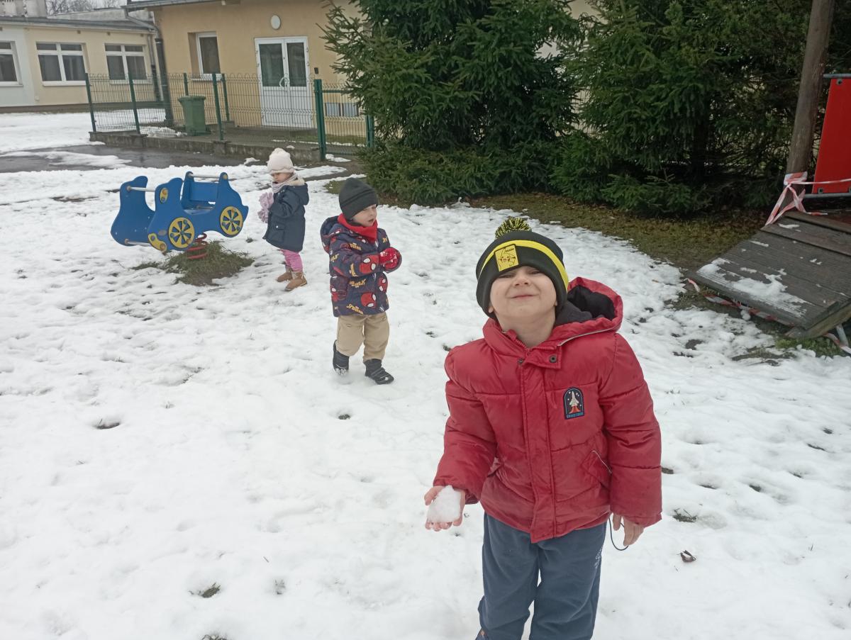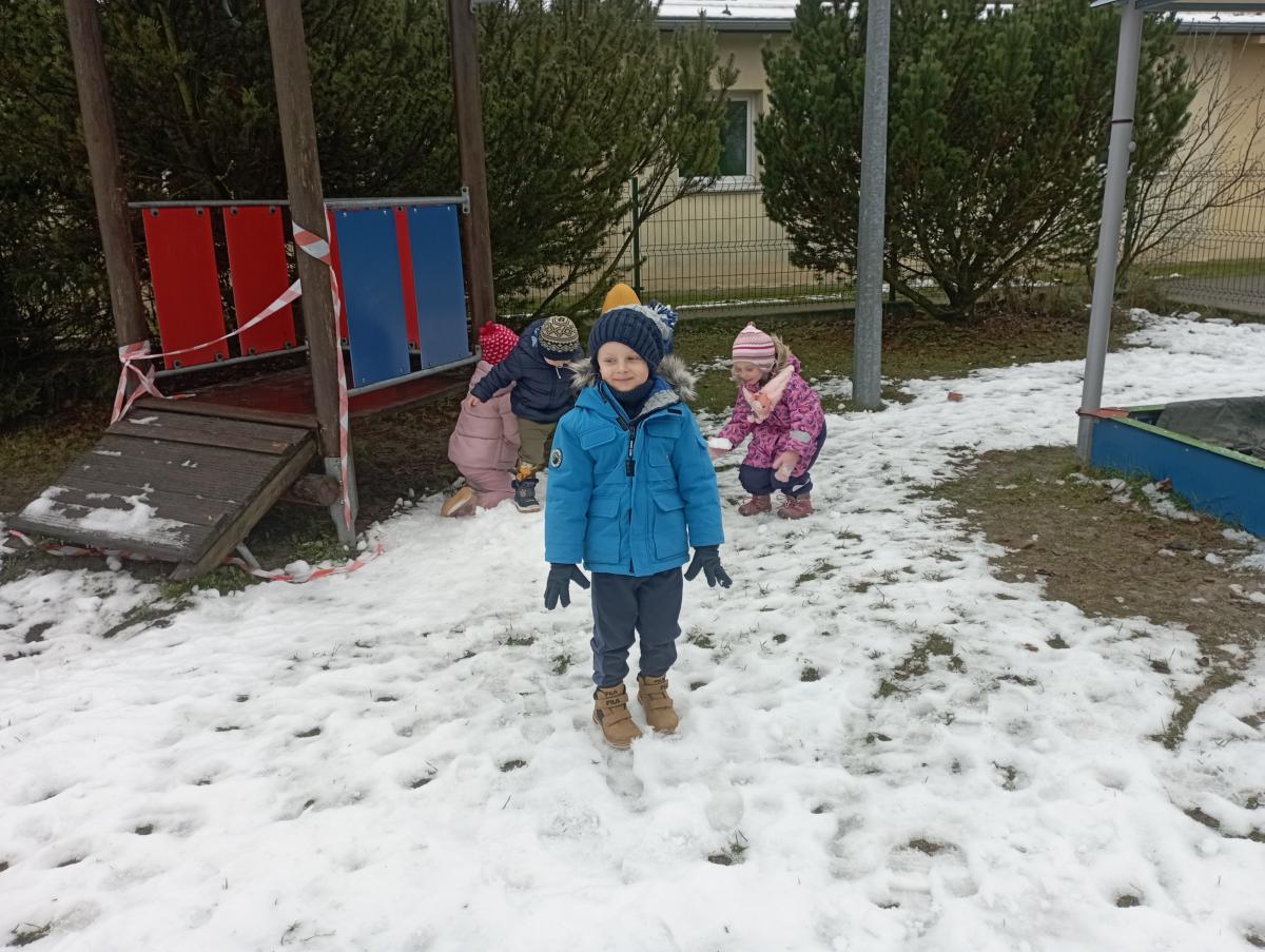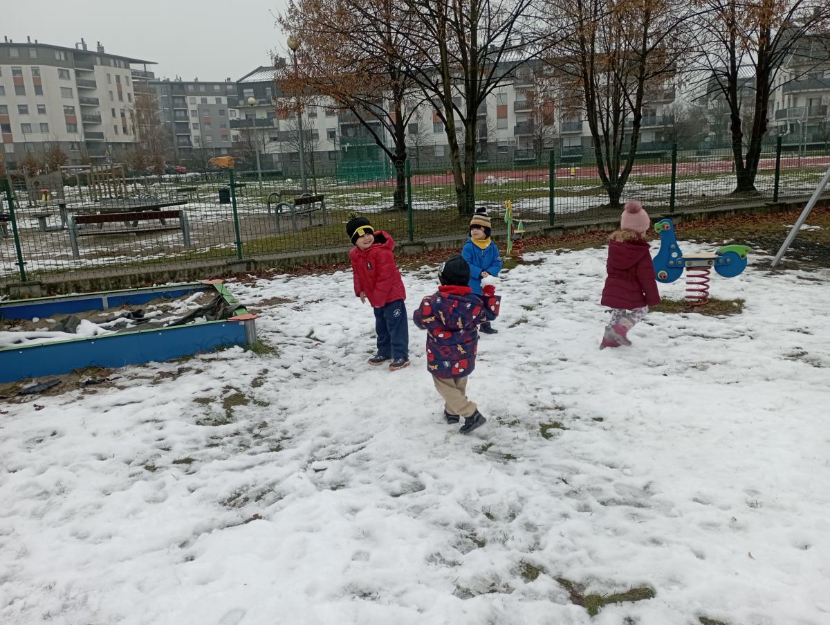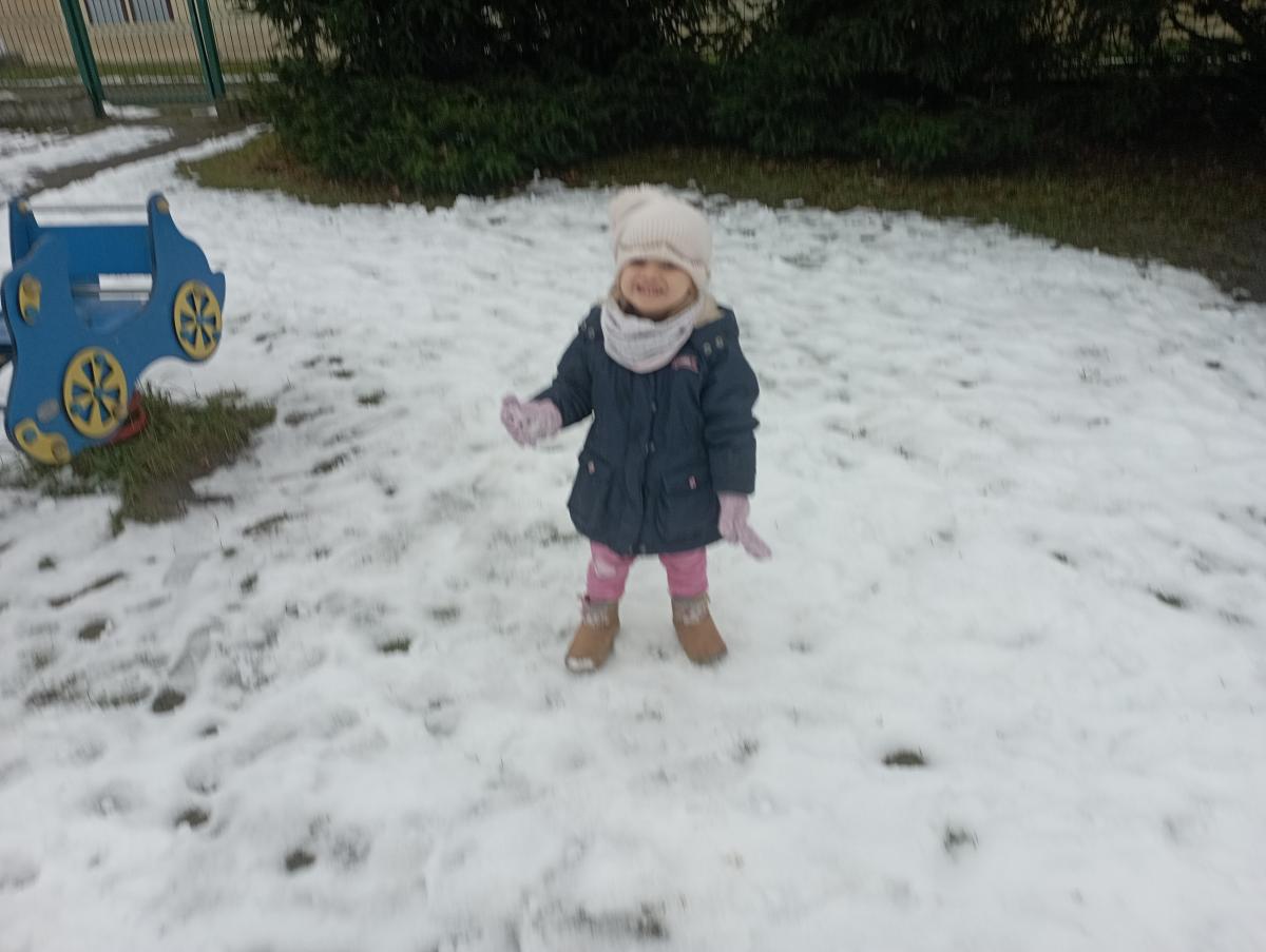 W końcu pojawił się wyczekiwany śnieg! Nie pozostał on z nami na długo, jednak udało się naszym maluchom choć przez chwilę, skorzystać z jego uroku :)
