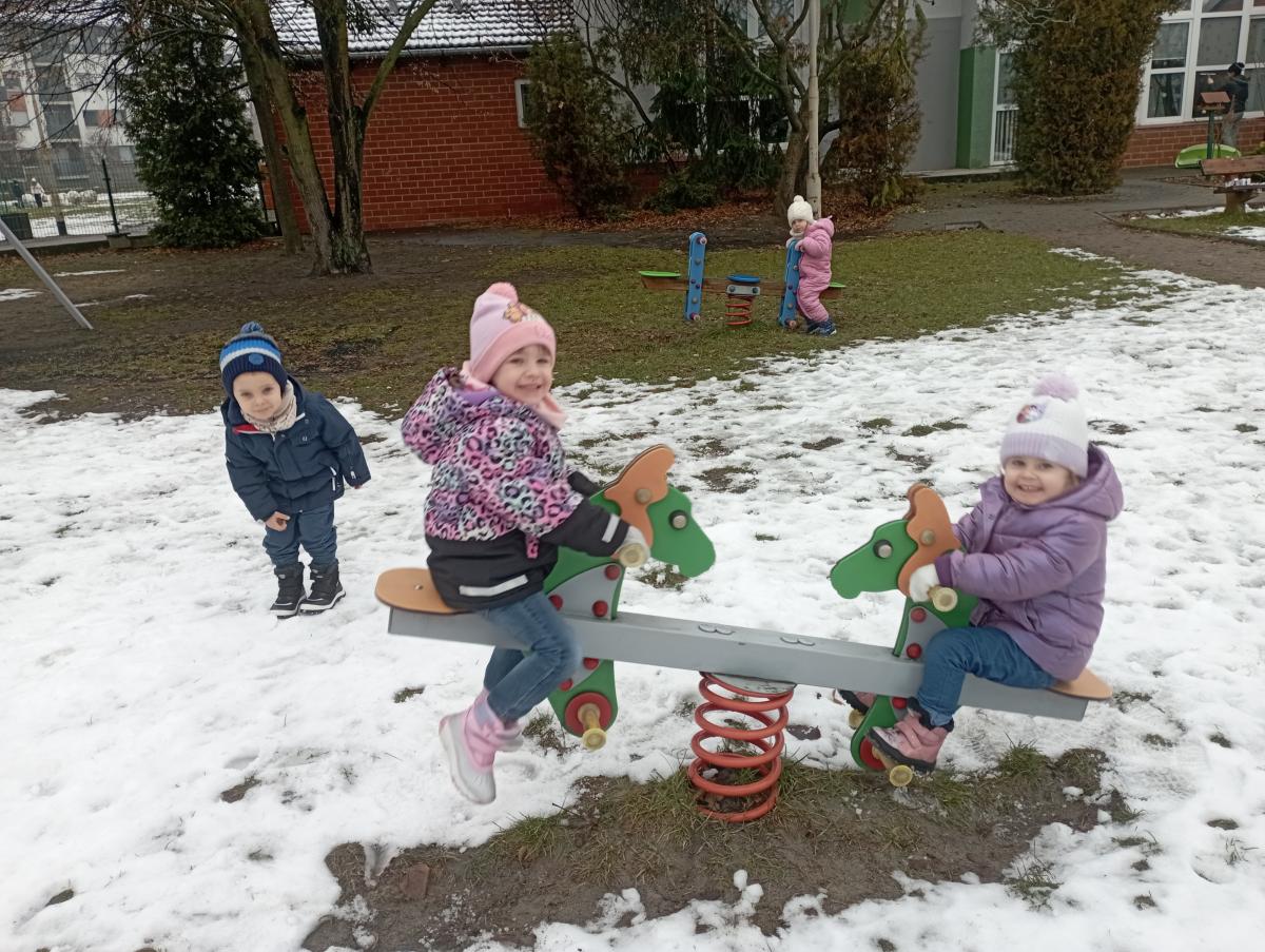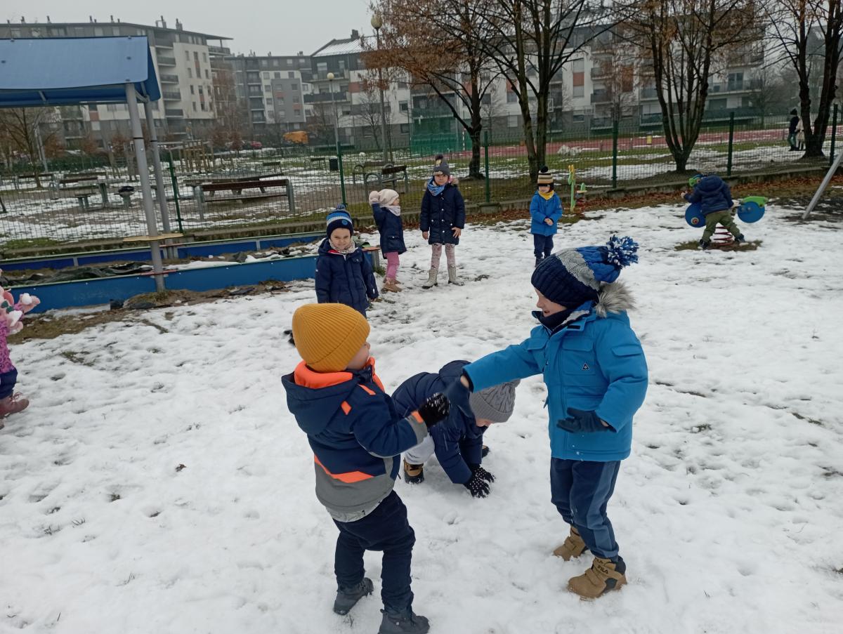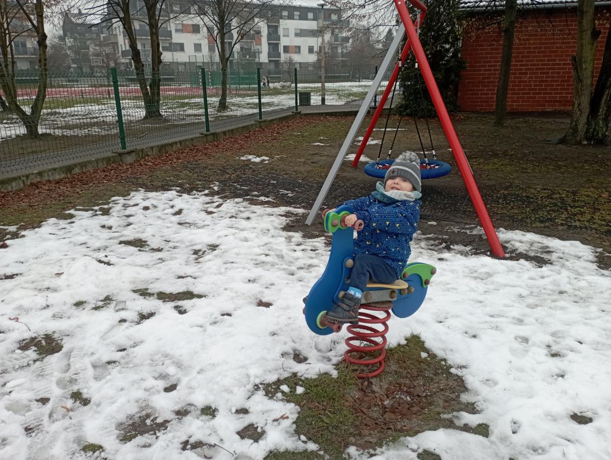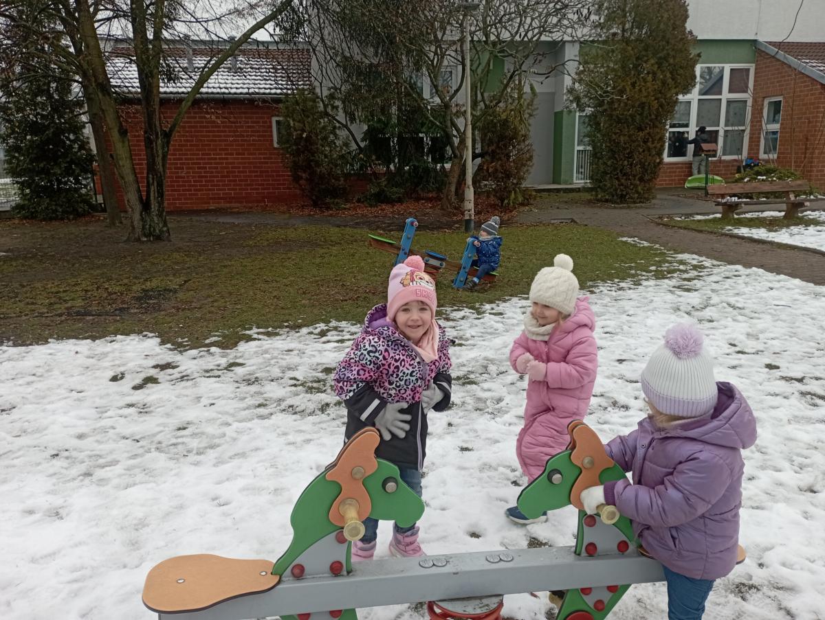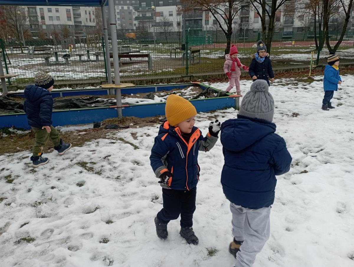 W końcu pojawił się wyczekiwany śnieg! Nie pozostał on z nami na długo, jednak udało się naszym maluchom choć przez chwilę, skorzystać z jego uroku :)
