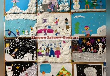 W konkursie plastycznym "Zimowe zabawy" wzięły udział dzieci z klas I-III uczęszczające do świetlicy szkolnej. W trakcie zajęć powstały prace z wykorzystaniem różnych form papieru, bibuły czy kolorowego papieru techniką wycinanek i wyklejanek. Wystawę prac konkursowych