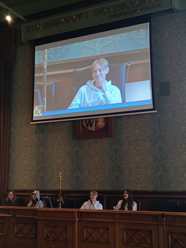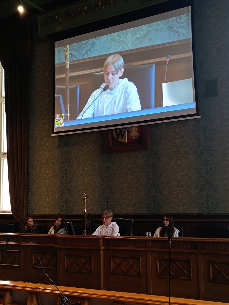 Uczniowie klas ósmych w ramach edukacji samorządowej zostali zaproszeni do wrocławskiego Magistratu. Ciekawą lekcję o samorządzie w sali posiedzeń Rady Miasta Wrocławia poprowadził dla naszych uczniów Pan Marcin Frąckiewicz w-ce dyrektor Biura Rady Miejskiej Wrocławia . Uczniowie dowiedzieli się na czym polega praca wrocławskich radnych, jakie są zadania Rady Miejskiej i Prezydenta Wrocławia. Przypomniał nam też o programie Nasz Wrocław, którego celem jest zachęcenie mieszkańców do aktywnego spędzania wolnego czasu oraz udziału w życiu miasta. Serdecznie dziękujemy