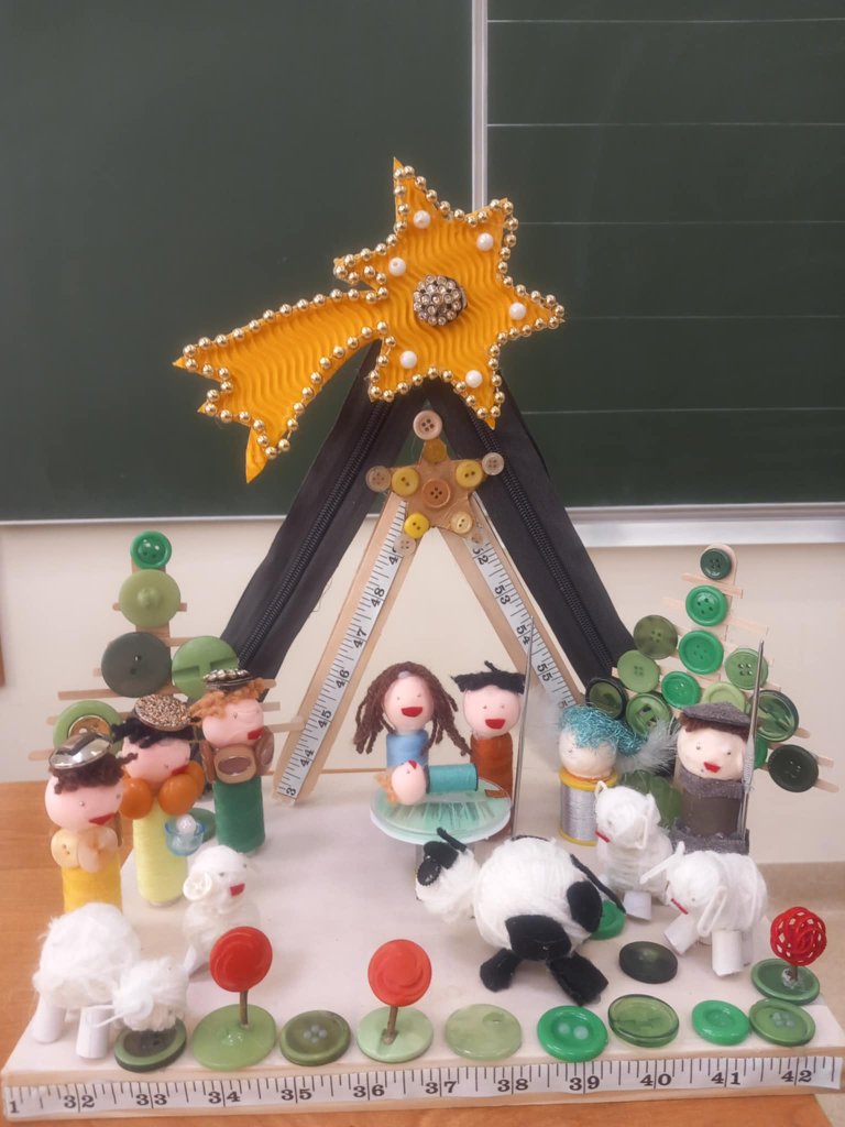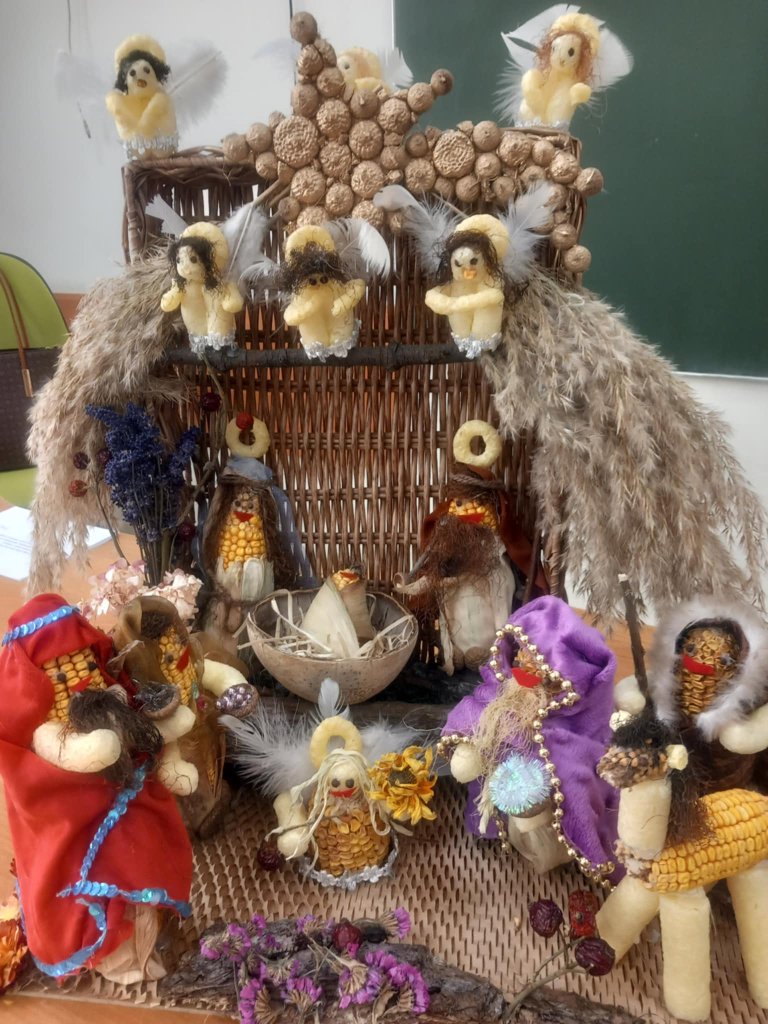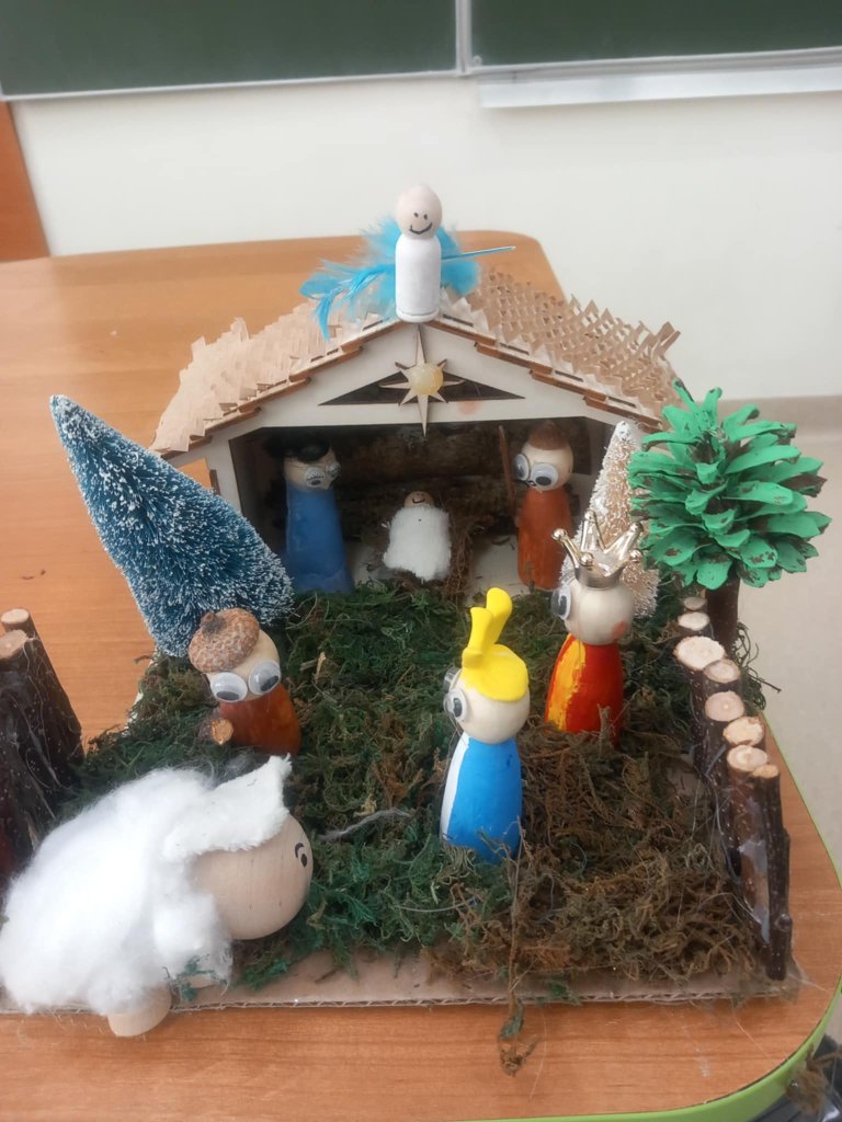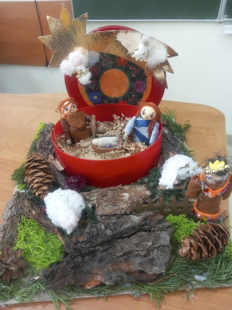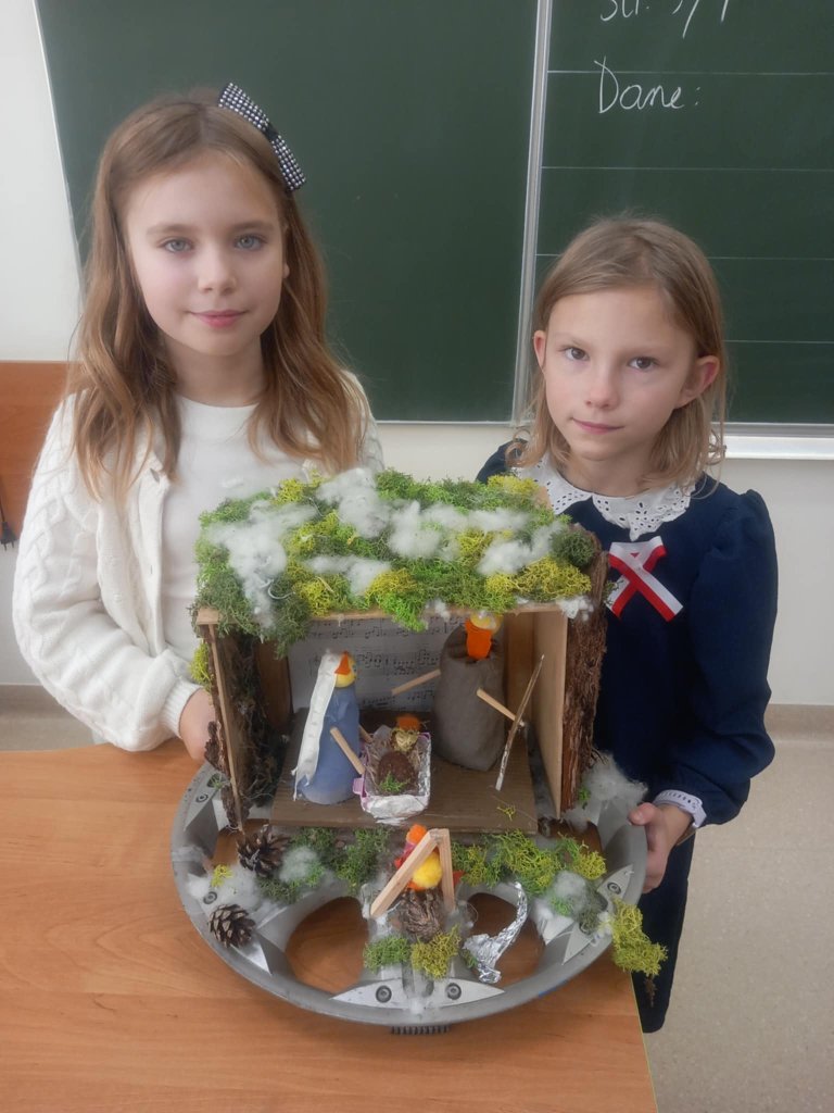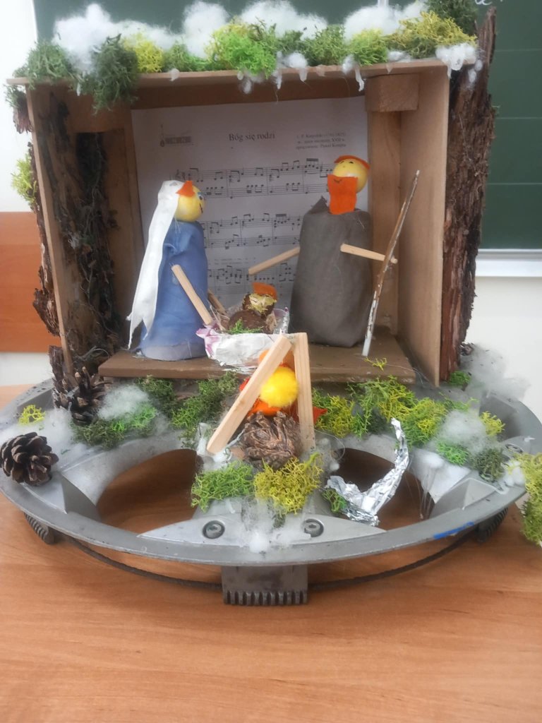 Uczniowie na warsztatach rękodzielniczych wykonali piękne prace. Wykodzystali kołpaki samochodowe, dary lasu, parku, sznurki, szpulki i co podpowiedziała inwencja twórcza. Klasa 3b lubi "robić szopki".