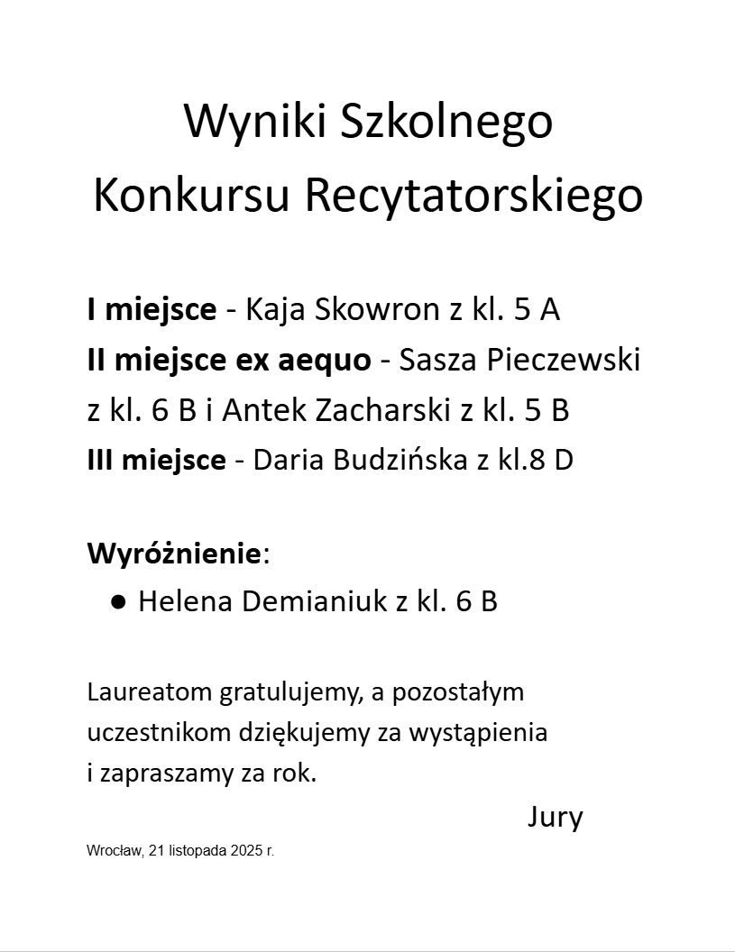 Wyniki Szkolnego Konkursu Recytatorskiego